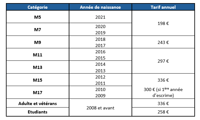 Pour la saison 2025/2026, les catégorie et tarifs de licences sont les suivants :